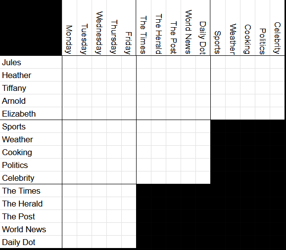 Well, y’see, there is this genre of puzzle games, sometimes digital, sometimes pen on paper such as in magazines or newspapers. Some call them logic puzzles, some call them elimination puzzles, but at the end of the day, the idea is that you have a set of categories, and you have to pair off every item uniquely whilst following rules.